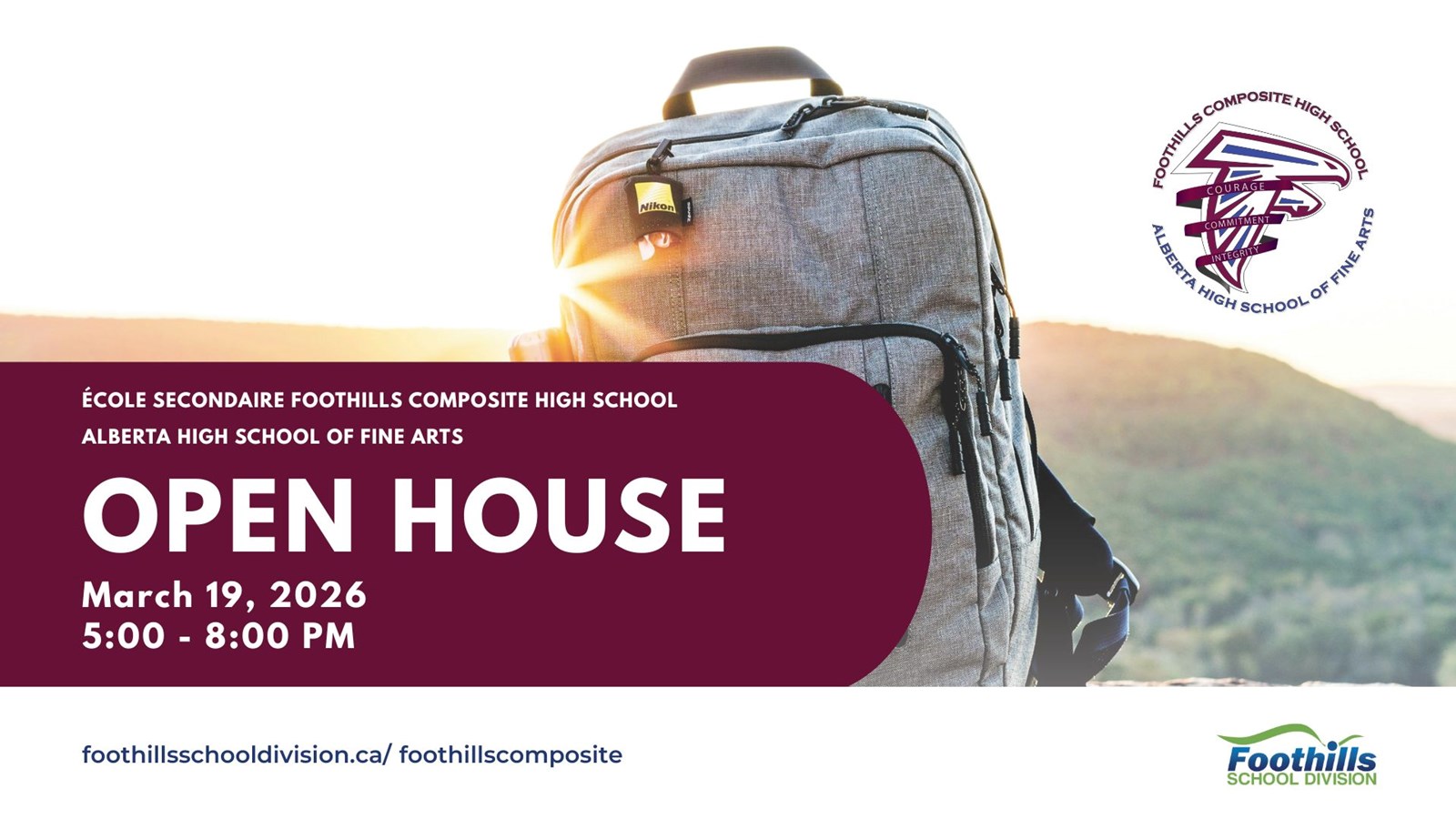 Grade 9 students and their families are invited to attend an open house at École Secondaire Foothills Composite High School | Alberta High School of Fine Arts on March 19, 2026. This is a great opportunity to visit the school, meet staff and ask questions you may have about our great programs including Fine Arts, Shop, Academics, Advanced Placement, Career Training, and so much more (click here to learn more about Making the Move to High School).